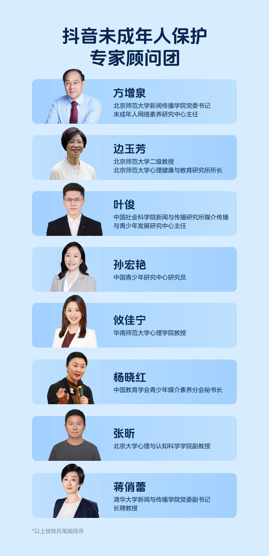 据介绍,抖音未成年人保护专家顾问团此次邀请8位长期深耕于未成年人教育、心理发展、网络素养等领域的专家学者,用他们多元的专业背景与深厚的学术积淀,为抖音未成年人保护工作提供系统性、前瞻性、多维度的科学指导与智力支持。